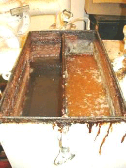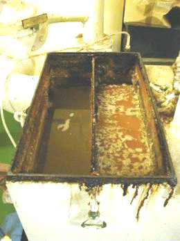 | The pictures above show Biosol Clear in action. The image on the left shows the start of build up of grease & fats in a grease trap on board a cruise liner within a week of manually cleaning. Biosol Clear was applied to the trap on a weekly basis for a trial period of 12 weeks.
